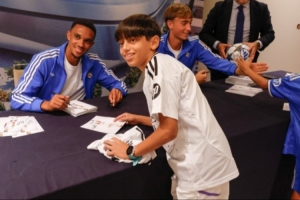 体育资讯9月13日讯 据西班牙六台报道,皇马后卫阿诺德和赫伊森为皇马小球迷们签名,并合影留念。