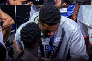 赛后,在场边观战的字母哥和施罗德拥抱致意。