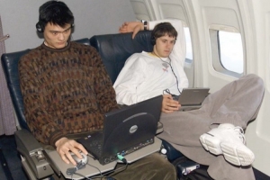 美媒写道:2002年,姚明在球队飞机上玩《过山车大亨》,而波斯简-纳赫巴在一旁看电影。