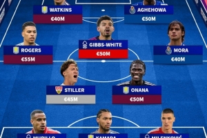 中场:罗杰斯(维拉)、斯蒂勒(斯图加特)、吉布斯-怀特(诺丁汉森林)、奥纳纳(维拉)、莫拉(波尔图)
