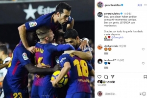 德乌洛费乌社媒晒出与布斯克茨等队友庆祝的合照,配文:“布斯克茨,很荣幸与你共度那些美好时刻,你是天才,名副其实的传奇,感谢你为这项运动奉献的一切。”