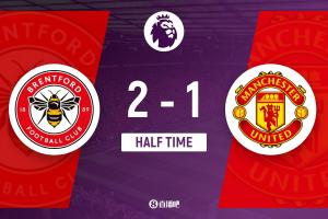 上半场伤停补时4分钟,半场结束,曼联暂1-2布伦特福德。