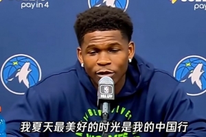 爱德华兹说到:“我夏天最美好的时光就是我的中国行,体验太与众不同了。我收到了来自中国球迷满满的爱,我建议每个球员都去中国玩一玩,去体验中国球迷对你们的喜爱,那都是真正的篮球迷。”