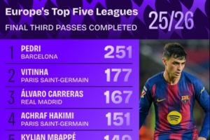 体育资讯10月1日讯 数据网站Squawka统计本赛季五大联赛进攻三区完成传球数,巴萨中场佩德里断档领先,皇马4人进入前十。