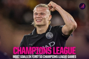 体育资讯10月2日讯 Squawka统计了球员在前50场欧冠比赛中的进球数量,并列出榜单,哈兰德52球断层居首。