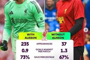 由于阿利森受伤,玛玛达什维利很可能在本场临危受命。英超官方也盘点了阿利森此前登场与否对于利物浦的影响,具体如下: