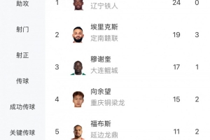 体育资讯10月6日讯 中甲联赛25轮战罢,射手榜方面,本轮双响的姆本扎24球领跑,本轮分别进球的埃里克斯和向余望分居第二和第四位。