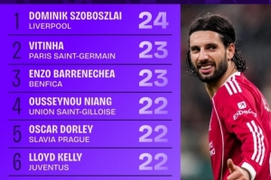 本赛季欧冠赢得控球权榜:索博斯洛伊24次第一,维蒂尼亚23次第二