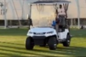 视频显示,亚马尔在巴萨的甘伯体育城训练基地,驾驶着一辆高尔夫球车在训练场上行驶。