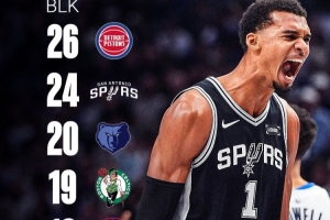 而截止目前,只有活塞、灰熊、凯尔特人、快船四支球队的盖帽总数比文班亚马要多。