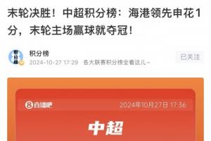 本赛季海港领先申花2分,末轮只需要打平就夺冠。