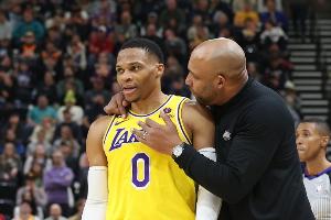 他说:“我是那个举手决定让威少替补出场的人。只是为了平衡我们的团队。因为我知道防守战术的布置,而勒布朗需要球权,安东尼·戴维斯需要球权,威少在场上——现在你有三个持球进攻型的球员。所以我知道,为了让我们的球队保持某种平衡,取得某种成功,我们必须平衡我们的打法。因此,他作为替补出场——对我们来说效果不错。”