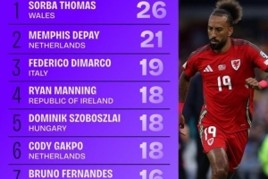 世预赛成功传中榜:德佩、迪马尔科分列二三,索博、B费在列
