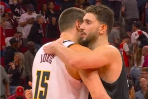 赛后,申京和约基奇拥抱寒暄。