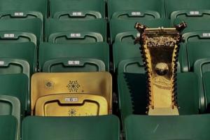 国安离世球迷杨雪的金色专属座椅,与金色的奖杯并肩