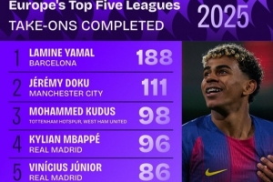体育资讯12月31日讯 2025年即将结束,squawka也统计了本年度成功过人情况,亚马尔断崖领跑。